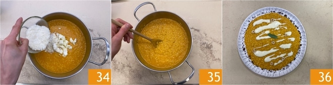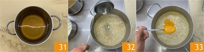 Le bouillon est prêt 31, versez-le progressivement dans le riz pour le cuire 32. Après environ 6-7 minutes, incorporez également la crème de potiron 33 et terminez la cuisson.