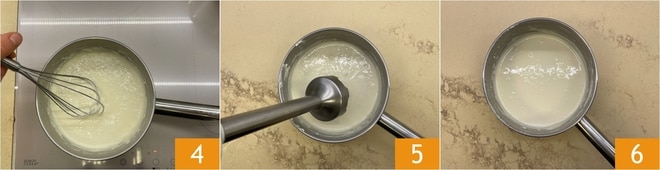 Portez à ébullition en mélangeant avec le fouet 4. Lorsque le fromage est fondu, retirez la casserole du feu et mixez avec le mixeur plongeant 5 pour obtenir une crème lisse et veloutée 6.
