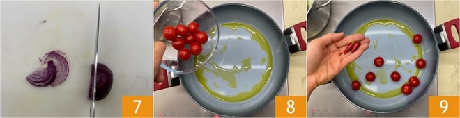 Passez à la crème de potiron : épluchez et émincez un demi-oignon 7, puis dans une poêle, versez un filet d'huile, les tomates cerises 8 et les piments entiers 9.