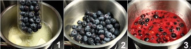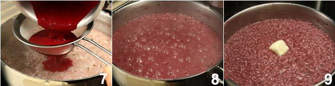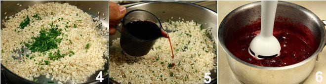 Dans une casserole, faites fondre le reste du beurre et faites griller le riz avec la ciboulette hachée pendant quelques minutes à feu modéré en remuant avec une cuillère en bois 4 ; déglacez avec le verre de vin rouge 5, laissez évaporer l'alcool, puis commencez à ajouter le bouillon, deux louches à la fois, en mélangeant délicatement avec la cuillère ; pendant ce temps, à l'aide d'un mixeur plongeant, mixez les myrtilles 6