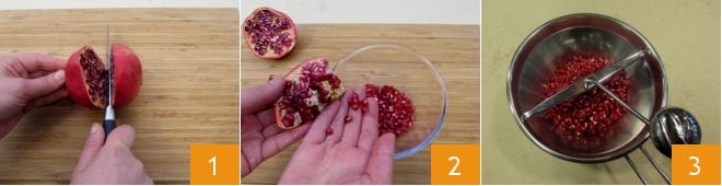 Pour préparer le risotto à la grenade avec crème de poireau, commencez par préparer le bouillon de légumes, puis égrenez la grenade : avec un couteau, incisez le fruit pour le diviser en deux 1, puis prélevez-en les grains 2 et mettez-en environ 20 g de côté pour la décoration finale. Vous pouvez passer le reste au moulin à légumes pour récolter le jus dans un petit bol 3.