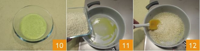 Gardez la crème de poireaux de côté 10. Passez maintenant au riz : dans une grande casserole, chauffez l'huile, versez le riz 10 pour le faire griller à feu moyen, en mélangeant pour qu'il ne colle pas au fond 12.