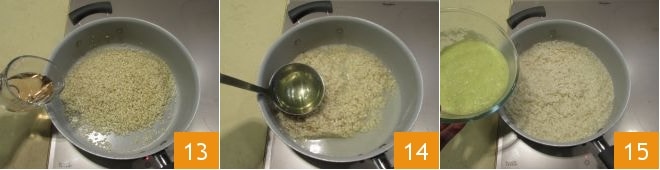 Puis déglacez avec le vin rosé 13 et lorsqu'il se sera évaporé, faites cuire le riz en ajoutant peu à peu le bouillon de légumes : cela prendra environ 20 minutes 14. À mi-cuisson, ajoutez la crème de poireaux au riz 15 et mélangez.