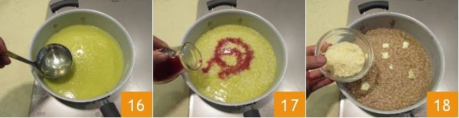 Versez encore 1 ou 2 louches de bouillon de légumes 16, lorsqu'il sera légèrement absorbé, versez le jus de grenade 17 et mélangez en poursuivant la cuisson. Éteignez le feu et ajoutez le beurre en petits morceaux et le Grana Padano DOP râpé 18, en mélangeant pour lier.