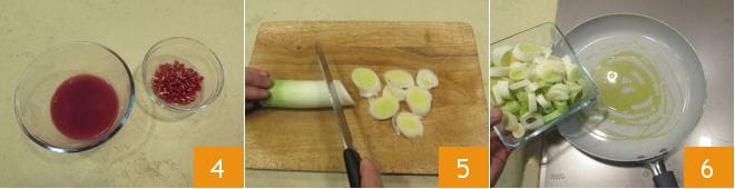 Mettez de côté le jus de grenade et les grains entiers 4. Ensuite, préparez la crème de poireau : enlevez la partie verte et la barbe du poireau, retirez la première couche et tranchez-le 5. Dans une poêle, versez l'huile, chauffez et ajoutez le poireau pour le faire fondre à feu doux 6