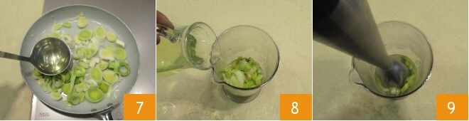Ajoutez une louche de bouillon de légumes pour favoriser la cuisson : cela prendra environ 5 à 10 minutes. Salez et poivrez en fin de cuisson, puis éteignez le feu et laissez tiédir légèrement. Une fois prêt, transférez-le dans un verre haut, ajoutez environ 200 g de bouillon de légumes 8 et mixez avec un mixeur plongeant 9 : vous devez obtenir un mélange crémeux et homogène.