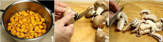 Pour préparer le risotto à la citrouille, champignons et taleggio, coupez la citrouille en tranches, épluchez-la et réduisez-la en dés, puis mettez-la à cuire dans un litre d'eau salée 1.