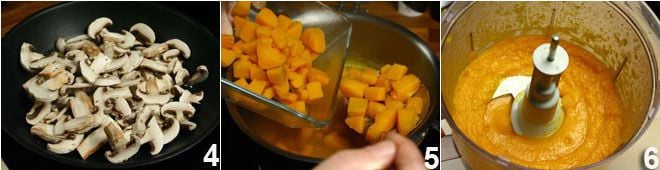 À la fin de la cuisson, ajoutez une pincée de sel aux champignons. Lorsque la citrouille est cuite, égouttez-la bien 5, conservez l'eau de cuisson qui servira à arroser le risotto, et réduisez-la en purée avec le mixeur 6.