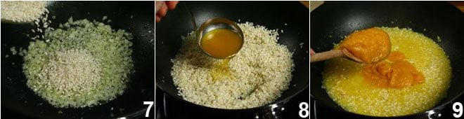 Mettez dans une grande casserole l'oignon haché et le beurre et laissez dorer quelques minutes ; versez le riz 7 et laissez-le griller un instant, puis déglacez avec le vin blanc et laissez cuire jusqu'à ce que le vin soit évaporé. Ajoutez ensuite une louche de liquide de cuisson de la citrouille 8 et ensuite la purée de citrouille 9 ;