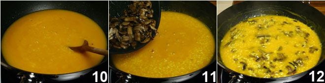 Continuez la cuisson du riz 10 et cinq minutes avant la fin, versez les champignons dans la casserole de riz 11 ; terminez la cuisson, puis éteignez le feu 12.