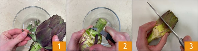 Pour préparer le risotto au safran avec artichauts et chèvre, commencez par Comment nettoyer les artichauts : retirez les feuilles extérieures 1, puis raccourcissez la tige et épluchez-la près de la base 2. Coupez les pointes 3 et divisez l'artichaut en deux.