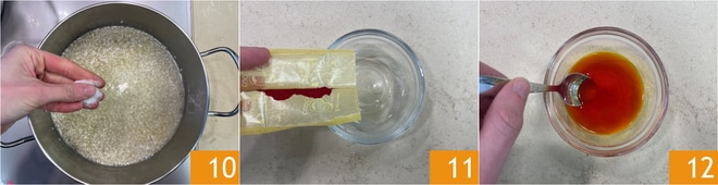 Salez 10 et faites cuire le riz en l'arrosant avec une louche d'eau chaude à la fois, en attendant toujours que le liquide soit absorbé avant d'en ajouter d'autre. Entre-temps, versez le safran dans un petit bol avec un peu d'eau tiède 11 et mélangez pour le dissoudre 12.