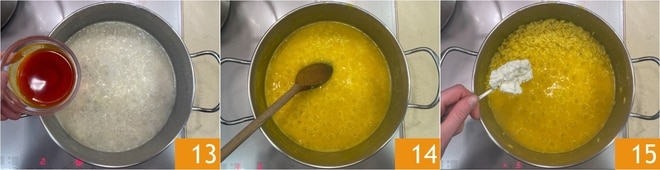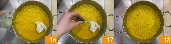 Quand il reste 5 minutes de cuisson du risotto, ajoutez le safran dissous 13 et mélangez bien 14. Une fois que le risotto est prêt, éteignez le feu et ajoutez la moitié du chèvre 15.