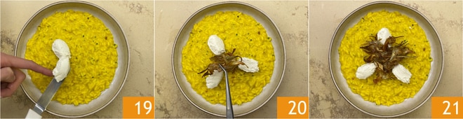 Servez le risotto au safran, puis formez des quenelles avec le chèvre restant et déposez-en 3 au centre 19. Enfin, complétez avec les artichauts frits 20. Votre risotto au safran avec artichauts et chèvre est prêt à être servi 21!