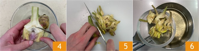 Enfin, enlevez le foin 4 et coupez les artichauts en fines tranches 5. Plongez les artichauts coupés dans de l'eau acidulée ou faites-les frire immédiatement dans l'huile de graines à une température de 180° pendant environ 2-3 minutes 6.