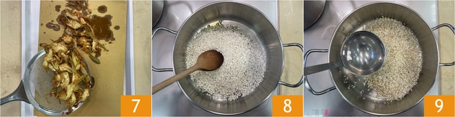 Lorsqu'ils sont croustillants et dorés, égouttez les artichauts et transférez-les sur du papier absorbant 7. Mettez de côté et portez à ébullition une casserole d'eau qui vous servira à cuire le risotto. Faites griller le riz dans une casserole avec un filet d'huile 8, puis déglacez avec une louche d'eau chaude 9.