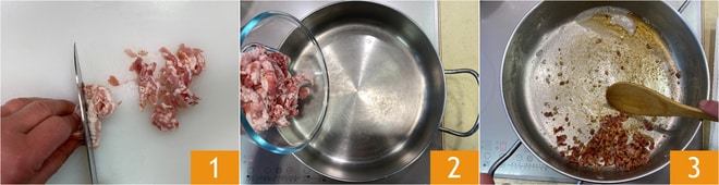 Pour préparer le risotto au safran avec taleggio et pancetta, commencez par préparer le bouillon de légumes selon notre recette. Coupez la pancetta en lanières 1, mettez-la dans une casserole 2 et faites cuire à feu moyen-vif pendant 10 minutes 3. La graisse qu'elle libérera servira à faire griller le riz.