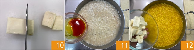 Coupez le taleggio en cubes, en éliminant la croûte 10. Quand il reste 5 minutes avant que le risotto soit cuit, ajoutez le safran dissous 11 et mélangez pour l'incorporer. Quand le riz est cuit, éteignez le feu et crémez avec le taleggio 12.