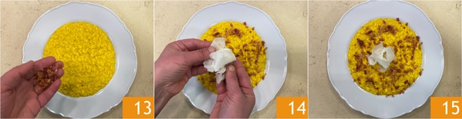 Dressez dans les assiettes et complétez avec la pancetta croustillante 13, puis garnissez avec quelques pétales de raspadura 14. Votre risotto au safran avec taleggio et pancetta est prêt à être servi 15 !