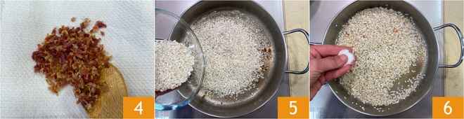 Transférez la pancetta croustillante sur du papier absorbant 4 et réservez. Dans la même casserole, versez le riz 5, ajoutez le sel 6 et faites griller pendant quelques minutes, jusqu'à ce que les grains soient chauds au toucher.