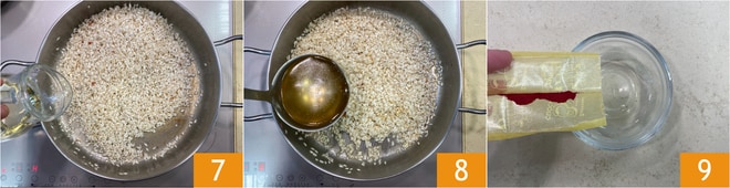 À ce stade, déglacez avec le vin blanc 7 et laissez évaporer complètement l'alcool. Faites cuire le riz en ajoutant une louche de bouillon à la fois, en attendant toujours que le précédent ait été absorbé 8. Entre-temps, dissolvez le safran dans un peu de bouillon tiède 9.