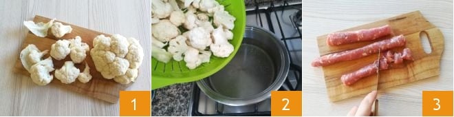 Pour réaliser le risotto au chou-fleur, saucisse et brie, commencez par préparer le bouillon de légumes, puis occupez-vous du chou-fleur : retirez les feuilles extérieures, enlevez la tige, séparez les fleurettes 1 et rincez-les sous l'eau courante. Portez à ébullition une casserole d'eau légèrement salée, ajoutez le chou-fleur 2 et blanchissez-le pendant environ 7-8 minutes. Pendant ce temps, coupez la saucisse en petits morceaux, après avoir retiré la peau 3, et émincez finement l'oignon.