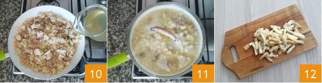 ensuite versez le bouillon chaud dans la poêle 10, remuez à nouveau, baissez le feu et couvrez avec un couvercle 11. Laissez cuire pendant environ 15-16 minutes, en mélangeant souvent et en ajoutant encore du bouillon chaud si le risotto devient trop sec. Pendant ce temps, coupez le fromage brie en cubes ou en lamelles 12.
