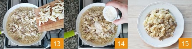Une fois le temps de cuisson écoulé, éteignez le feu et mélangez avec le brie 13 et le Grana Padano AOP râpé 14. Mélangez pendant environ une minute pour bien amalgamer les fromages et servez votre risotto au chou-fleur, saucisse et brie bien chaud 15 !