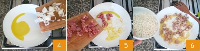 Chauffez l'huile dans une grande poêle, ajoutez l'oignon 4 et la saucisse 5 et faites revenir à feu moyen pendant 2-3 minutes, en remuant souvent. Une fois que la saucisse est dorée, versez le riz dans la poêle 6