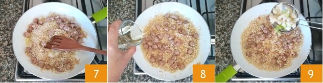 et toastez-le pendant quelques minutes en continuant de remuer 7. Quand le riz devient transparent, déglacez avec le vin blanc 8 et laissez évaporer complètement. À ce stade, ajoutez le chou-fleur blanchi 9 et mélangez bien,