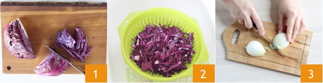 Pour préparer le risotto au chou rouge et gorgonzola, commencez par nettoyer le chou. Éliminez les feuilles les plus extérieures et coupez-le en fines tranches en retirant la partie centrale blanche et épaisse 1. Rincez sous un jet d'eau fraîche et égouttez 2. Ensuite, pelez l'oignon et émincez-le finement 3.