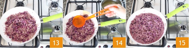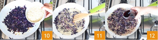 Passez à la cuisson du riz. Versez-le dans la poêle avec le chou 10 et faites-le griller pendant 3 minutes en mélangeant avec une cuillère en bois pendant 3 minutes 11. Ensuite, mouillez avec le vin rouge 12
