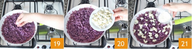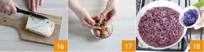 Quand la cuisson est presque terminée, préparez le reste des ingrédients. Retirez la croûte du gorgonzola et coupez-le en morceaux 16, puis décortiquez les noix et obtenez 50 g de cerneaux 17. Bien, ajoutez la crème de chou rouge au risotto 18.