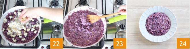 Enfin, ajoutez les cerneaux de noix 22 et mélangez bien le tout 23. Voilà votre risotto au chou rouge et gorgonzola prêt, bon appétit 24.