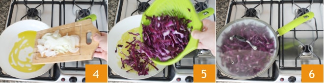 Allez aux fourneaux et gardez au chaud le bouillon de légumes. Mettez une poêle sur le feu, ajoutez un filet d'huile et faites revenir l'oignon à feu doux pendant quelques minutes 4. Puis plongez le chou rouge 5, couvrez avec le couvercle et faites cuire pendant 5 minutes 6,