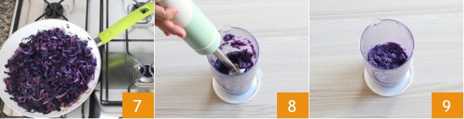 le temps nécessaire pour ramollir les feuilles 7. Transférez environ 2/3 du chou dans un verre haut et étroit 8 et mixez avec un mixeur plongeant pour obtenir une crème 9.