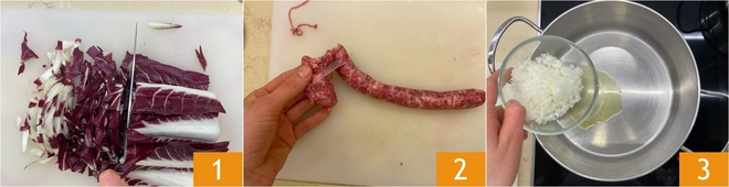 Pour préparer le risotto au radicchio et à la saucisse, coupez le radicchio en lanières 1, enlevez le boyau de la saucisse et émiettez-la 2. Versez l'huile d'olive extra vierge dans une casserole, ajoutez l'oignon haché et laissez-le flétrir à feu doux 3.