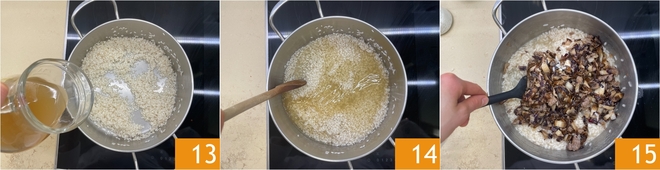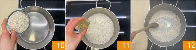 Dans une casserole, ajoutez le riz carnaroli et faites-le griller 10. Lorsque les grains sont très chauds, déglacez avec du vin blanc 11. Laissez l'alcool s'évaporer en maintenant le feu à moyen-élevé 12.