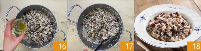 Mélangez avec l'huile d'olive extra vierge 16. Ajustez le sel et le poivre, donnez un dernier mélange avec une spatule 17 et votre risotto au radicchio et à la saucisse est prêt à déguster 18 !