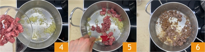 Après environ 3 minutes, ajoutez la saucisse sans boyau 4. Maintenez la température à moyen-élevé et, avec une spatule, remuez souvent 5. Continuez à la cuire pendant environ 7 minutes ou jusqu'à ce qu'elle soit bien dorée 6.