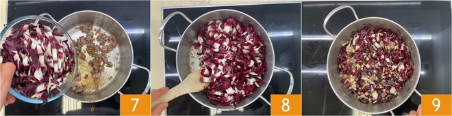À ce stade, vous pouvez ajouter le radicchio coupé en lanières 7. Mélangez bien avec une cuillère 8, laissez cuire encore 3 minutes et réservez 9.
