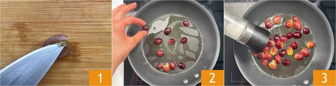 Pour réaliser le risotto au vin, raisin et chèvre, commencez par laver et couper les raisins en deux, puis retirez les pépins 1. Chauffez un filet d'huile dans une poêle et disposez les raisins avec la partie coupée vers le bas 2. Saisissez les raisins pendant quelques minutes, salez 3 et réservez.