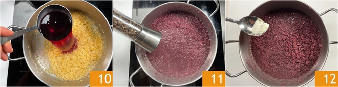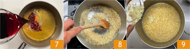 Dans une casserole, versez le bouillon de légumes et le vin rouge 7, puis portez à ébullition et gardez au chaud. Reprenez la casserole où vous avez cuit l'oignon et faites griller le riz à feu moyen-élevé pendant environ 5 minutes, en remuant souvent 8. Lorsque les grains sont bien chauds, ajoutez l'oignon 9.