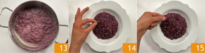 Mélangez bien le tout pour amalgamer 13. Garnissez les assiettes avec quelques feuilles de marjolaine 14 et les raisins poêlés 15. Votre risotto au vin, raisin et fromage de chèvre est prêt à être servi!