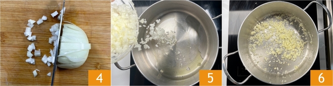 Maintenant, épluchez et hachez finement l'oignon 4. Versez l'oignon dans une casserole avec un filet d'huile 5, salez et couvrez avec un couvercle. Faites mijoter environ 5 minutes à feu moyen-doux, en ajoutant un peu d'eau si nécessaire ; l'oignon ne doit pas colorer 6. Réservez.