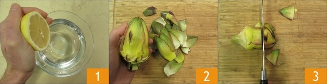 Pour réaliser le risotto aux artichauts et pancetta croustillante, commencez par préparer un bol avec de l'eau acidulée avec quelques gouttes de citron 1. Nettoyez les artichauts: enlevez les feuilles extérieures 2 et coupez la pointe la plus coriace des feuilles intérieures 3. Avec un couteau d'office ou un économe, éliminez la partie la plus externe et filandreuse de la tige.