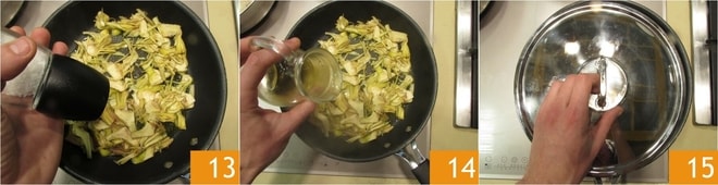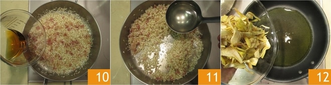 Déglacez avec l'amer 10 et laissez évaporer l'alcool. Continuez à cuire en ajoutant progressivement le bouillon chaud jusqu'à ce que le riz soit cuit, cela prendra 18-20 minutes. Pendant ce temps, dans une autre poêle, chauffez un filet d'huile et versez les artichauts bien égouttés 12.