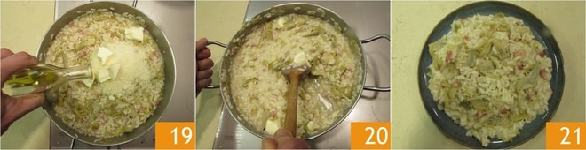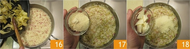Ajoutez les artichauts au risotto 16, qui aura terminé sa cuisson, éteignez le feu et mélangez avec le fromage râpé 17, le beurre 18