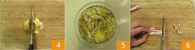 Coupez les artichauts en deux et éliminez le "foin" à l'intérieur, puis tranchez-les 4. Placez les artichauts dans l'eau acidulée pour qu'ils ne noircissent pas 5. Coupez la pancetta en lanières 6.