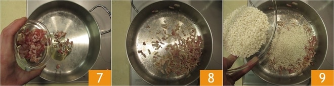Dans une casserole, chauffez un filet d'huile 7 et faites revenir la pancetta 8. Ajoutez le riz 9 et faites-le griller pendant quelques minutes.